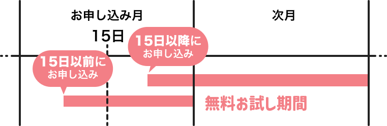 15日以前にお申し込みの場合は、その月の終わりまで、 15日以降(15日を含む)にお申し込みの場合は、その次月の終わりまで の期間を月額料金を無料でお試しいただけます。